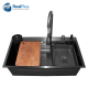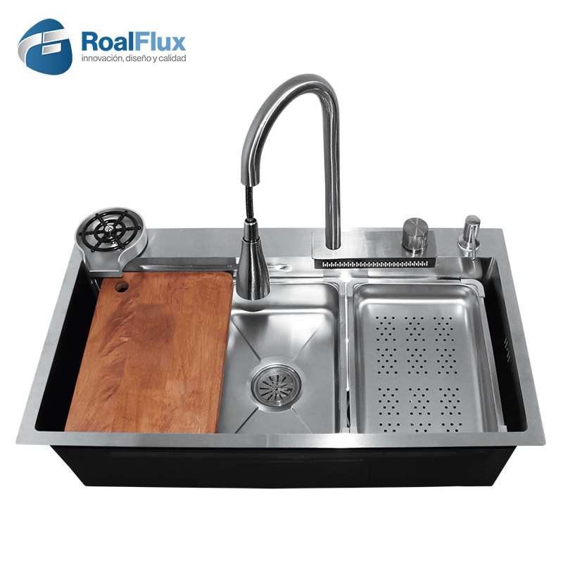Set de tarja para fregadero satinada 80x45cm de acero inoxidable con monomando de doble función con extensión flexible, dispensador de jabón, lava vaso, tabla de picar y doble cesta.