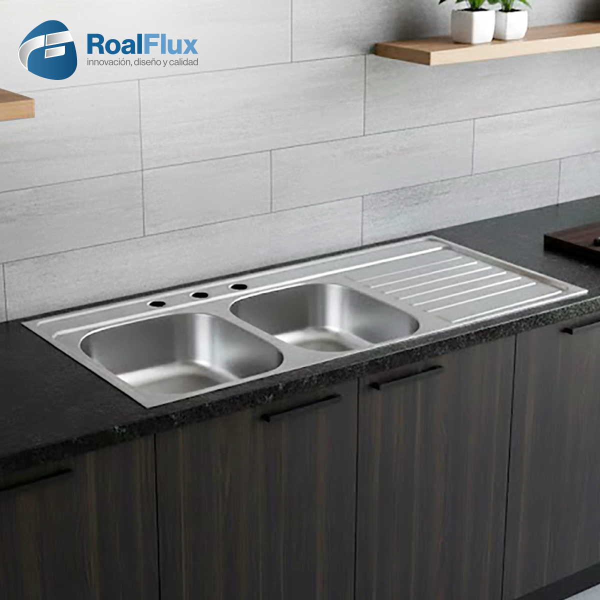 Tarja de empotrar doble tima 120x50cm con escurridor derecho de acero inoxidable con tres perforaciones para grifería.